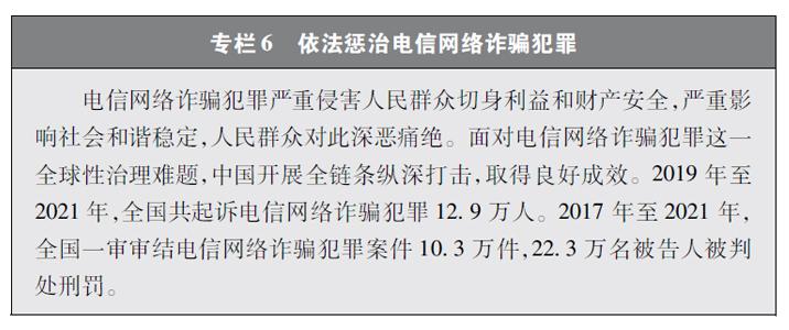 加大網(wǎng)絡(luò)犯罪懲治力度。隨著互聯(lián)網(wǎng)技術(shù)的快速發(fā)展,傳統(tǒng)犯罪加速向以互聯(lián)網(wǎng)為媒介的非接觸式犯罪轉(zhuǎn)變,電信網(wǎng)絡(luò)詐騙、網(wǎng)絡(luò)賭博、網(wǎng)絡(luò)淫穢色情等涉網(wǎng)違法犯罪多發(fā)。中國依法辦理新型網(wǎng)絡(luò)犯罪案件。連續(xù)多年開展“凈網(wǎng)行動”,嚴(yán)厲打擊群眾反映強烈的黑客攻擊破壞、侵犯公民個人信息等違法犯罪活動。持續(xù)推進(jìn)“云劍”“斷卡”“斷流”“拔釘”等專項行動,打擊套路貸、校園貸、“以房養(yǎng)老”、“投資養(yǎng)老”等電信網(wǎng)絡(luò)詐騙犯罪,依法懲處為電信網(wǎng)絡(luò)詐騙犯罪團(tuán)伙提供互聯(lián)網(wǎng)接入、域名注冊、服務(wù)器托管、移動互聯(lián)網(wǎng)應(yīng)用程序制作開發(fā)、網(wǎng)絡(luò)支付、引流推廣等服務(wù)支撐的黑灰產(chǎn)業(yè)。完善國家反詐大數(shù)據(jù)平臺和反詐移動互聯(lián)網(wǎng)應(yīng)用程序,建設(shè)國家涉詐黑樣本庫,完善快速止付凍結(jié)機(jī)制、涉詐資金返還機(jī)制。堅決打擊網(wǎng)絡(luò)賭博犯罪行為,從嚴(yán)治理網(wǎng)絡(luò)淫穢色情。網(wǎng)絡(luò)犯罪治理工作取得明顯成效,人民群眾安全感有效提升,社會更加和諧穩(wěn)定。