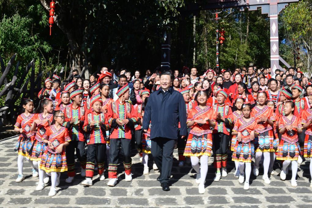 2020年1月19日至21日,習(xí)近平總書(shū)記來(lái)到云南,看望慰問(wèn)各族干部群眾,向全國(guó)人民致以新春祝福。這是19日下午,騰沖市清水鄉(xiāng)三家村中寨司莫拉佤族村的鄉(xiāng)親們唱著《阿佤人民唱新歌》,簇?fù)碇?xí)近平總書(shū)記走出村口。新華社記者 謝環(huán)馳 攝