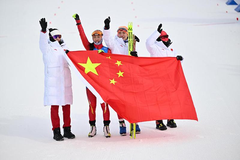 2月13日,中國隊選手褚源蒙、孟繁棋、唐佳琳、文穎(從左到右)在賽后慶祝。新華社記者 謝劍飛 攝