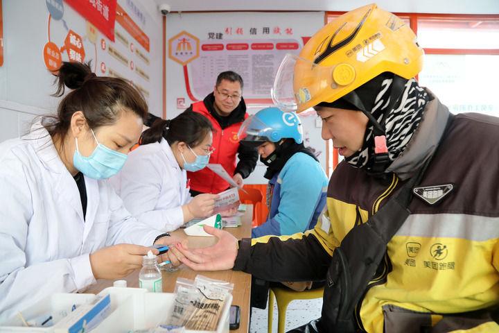 2025年3月5日,志愿者在山東省棗莊市市中區(qū)一工會(huì)驛站為外賣員免費(fèi)測量血糖。新華社發(fā)(王海楠攝)
