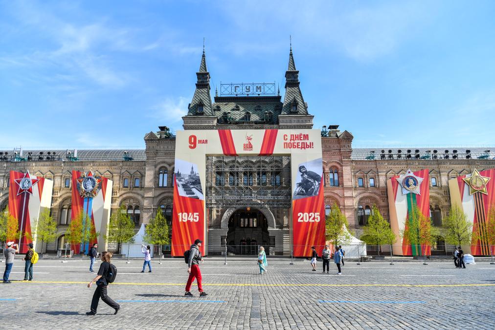 紀(jì)念蘇聯(lián)偉大衛(wèi)國(guó)戰(zhàn)爭(zhēng)勝利80周年慶典前夕,莫斯科街頭,寫有“勝利”字樣的旗幟隨風(fēng)飄揚(yáng)。在路邊,以蘇聯(lián)衛(wèi)國(guó)戰(zhàn)爭(zhēng)歷史為主題的圖片展板和裝飾櫥窗吸引行人停下腳步,或合影留念,或?yàn)g覽沉思。