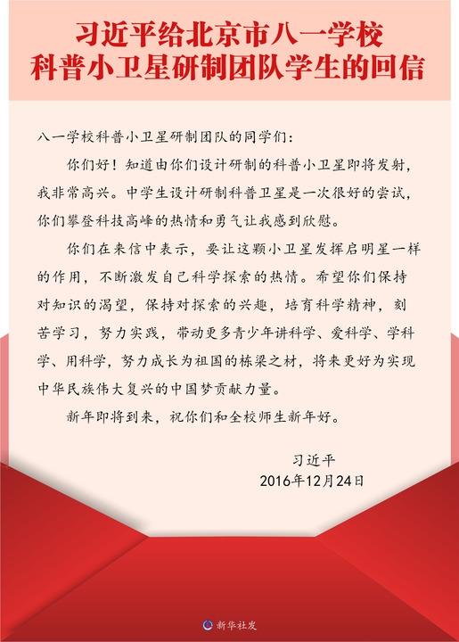 三個(gè)多月后,同學(xué)們給習(xí)近平總書記寫信,報(bào)告小衛(wèi)星即將發(fā)射的消息,很快收到了總書記的回信。習(xí)近平總書記在回信中說(shuō),“你們攀登科技高峰的熱情和勇氣讓我感到欣慰”“希望你們保持對(duì)知識(shí)的渴望,保持對(duì)探索的興趣,培育科學(xué)精神,刻苦學(xué)習(xí),努力實(shí)踐,帶動(dòng)更多青少年講科學(xué)、愛科學(xué)、學(xué)科學(xué)、用科學(xué),努力成長(zhǎng)為祖國(guó)的棟梁之材”。