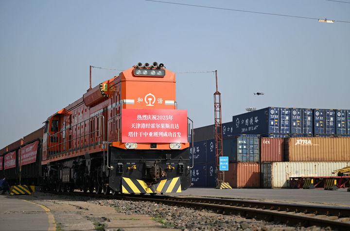 2025年5月20日,2025年首列天津港經(jīng)霍爾果斯直達塔什干的中亞班列從天津港物捷三堆場發(fā)車。新華社記者 趙子碩 攝