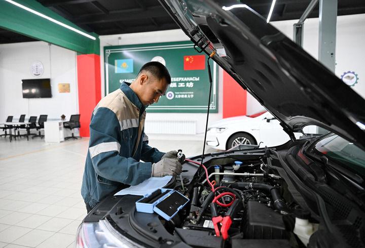 2025年5月9日,在哈薩克斯坦東哈薩克斯坦州首府厄斯克門的魯班工坊,學員練習汽車檢修技能。新華社記者 李任滋 攝