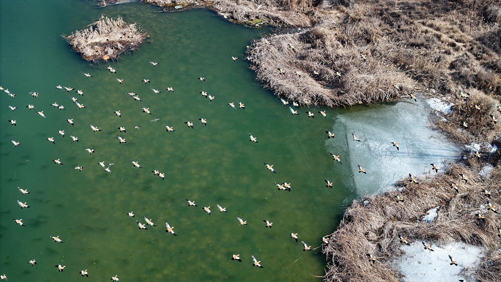 候鳥(niǎo)在黃河寧夏段一處濕地棲息、覓食(2025年2月26日攝,無(wú)人機(jī)照片)。新華社記者 王鵬 攝