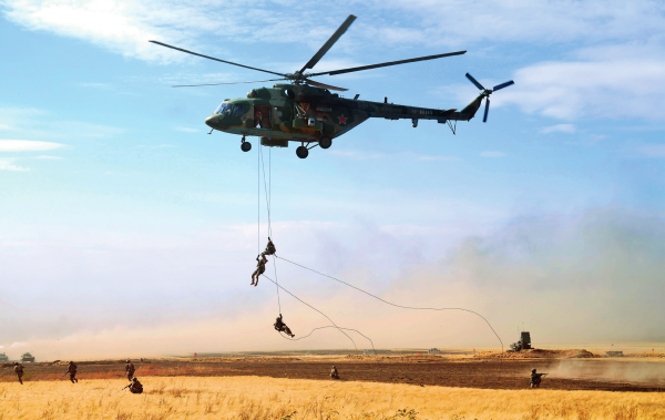 在俄羅斯奧倫堡州東古茲靶場舉行的“和平使命-2021”上海合作組織聯(lián)合反恐軍事演習(xí)實兵實彈演習(xí)中,多國聯(lián)合部隊特戰(zhàn)分隊執(zhí)行索降作戰(zhàn)任務(wù)(資料照片) 梅世雄攝/本刊