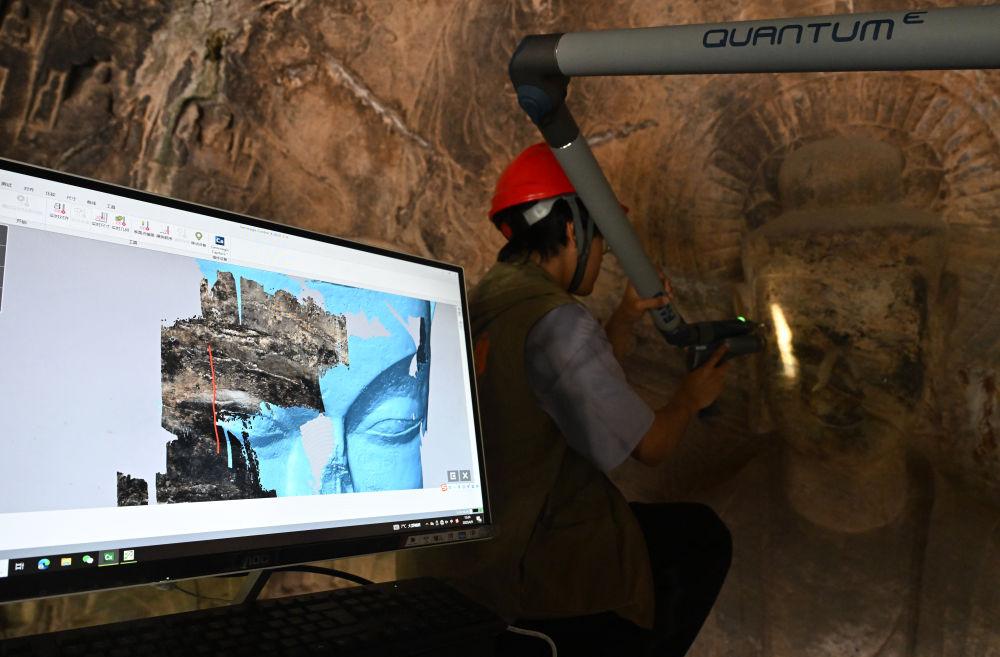 2025年4月9日,武漢大學(xué)文化遺產(chǎn)智能計(jì)算實(shí)驗(yàn)室團(tuán)隊(duì)成員在河南洛陽(yáng)龍門(mén)石窟魏字洞使用關(guān)節(jié)臂掃描儀對(duì)佛像進(jìn)行數(shù)字化掃描。從2005年起,龍門(mén)石窟研究院開(kāi)始為龍門(mén)石窟建立數(shù)字化檔案,借助激光掃描、高清攝影等技術(shù)手段收集文物數(shù)據(jù),以數(shù)字的形式留存千年石刻群的風(fēng)貌,致力于讓這一規(guī)模宏大、氣勢(shì)磅礴的石窟瑰寶“芳華永駐”。