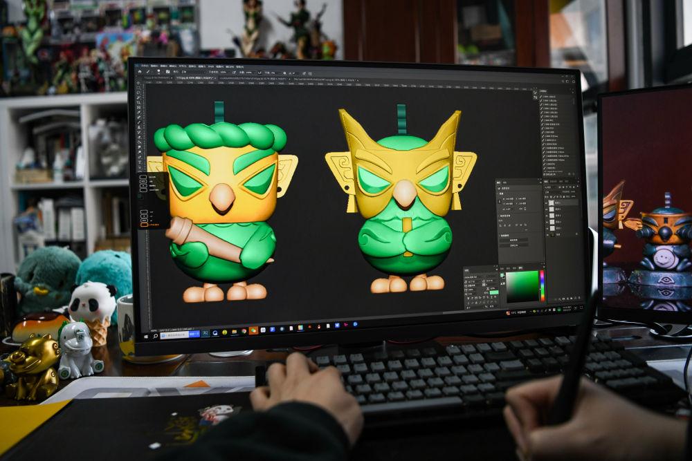2025年3月1日,文創(chuàng)產(chǎn)品策劃運(yùn)營(yíng)師曾舟在位于四川成都的辦公室內(nèi)完善文創(chuàng)產(chǎn)品細(xì)節(jié)。他以三星堆青銅神樹(shù)、青銅縱目面具、青銅獸面等文物為創(chuàng)作藍(lán)本,結(jié)合潮玩元素設(shè)計(jì)的文創(chuàng)作品廣受歡迎?!拔蚁胱龅牟皇峭婢呖煜罚怯袃?nèi)容、有溫度、有意義的文化IP,讓年輕一代隨手摸到沉淀千年的文化?!痹壅f(shuō)。