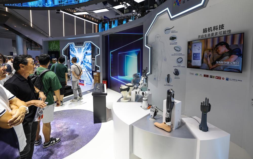 9月25日,在第四屆全球數(shù)字貿(mào)易博覽會(huì)數(shù)智未來(lái)主題展區(qū)的杭州六小龍專區(qū),觀眾在觀看強(qiáng)腦科技的智能仿生手。新華社記者 徐昱 攝