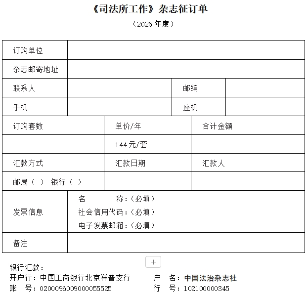 若不能進(jìn)行在線(xiàn)提交訂單,請(qǐng)將本征訂單填寫(xiě)完整后與匯款憑證一并發(fā)郵件至sfsgzfxb@moj.gov.cn或添加微信13681283507/13681570831后發(fā)送電子版征訂單與匯款憑證。