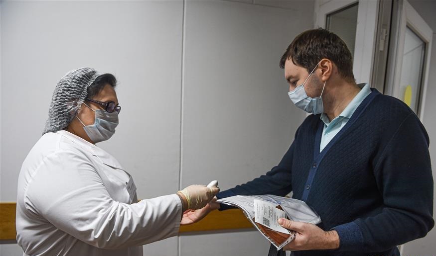 12月8日,在俄羅斯首都莫斯科,醫(yī)護人員為一名申請接種新冠疫苗的男子測量體溫。 位于莫斯科的70多個站點從12月5日起啟動新冠疫苗接種工作,自愿申請接種的醫(yī)護人員、教師等高風(fēng)險感染人群將優(yōu)先接種該疫苗。 新華社發(fā)(葉甫蓋尼·西尼岑 攝)