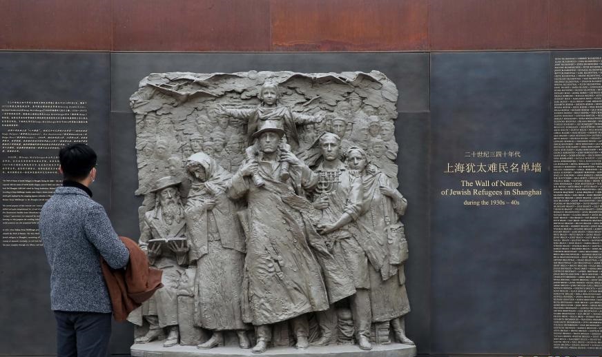 12月8日,觀眾在上海猶太難民紀念館廣場參觀上海猶太難民名單墻。