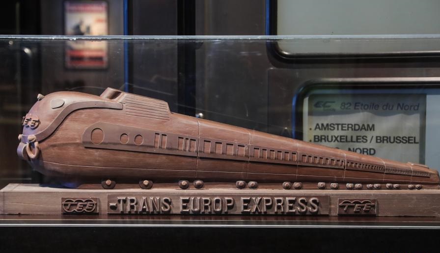 這是12月15日在比利時布魯塞爾火車世界博物館拍攝的一件藝術(shù)家以全歐快車為原型而創(chuàng)作的巧克力火車雕塑。