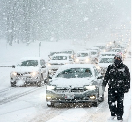當?shù)貢r間12月16日,美國馬里蘭州,當?shù)赜瓉泶笱?,?dǎo)致交通堵塞。(圖片來源:東方IC)