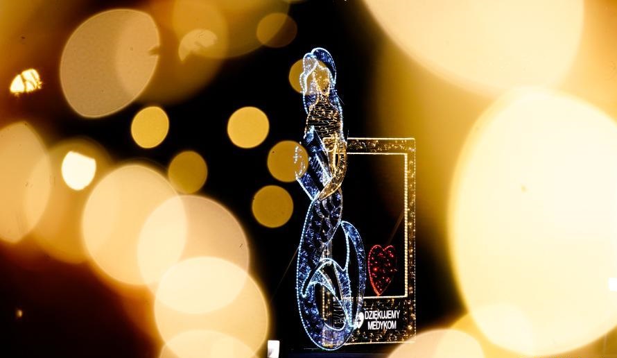 12月16日,波蘭華沙點(diǎn)亮彩燈,向抗擊新冠疫情的醫(yī)務(wù)人員表示感謝。這處彩燈左側(cè)的美人魚為華沙的象征,右側(cè)有“感謝醫(yī)務(wù)人員”的字樣。