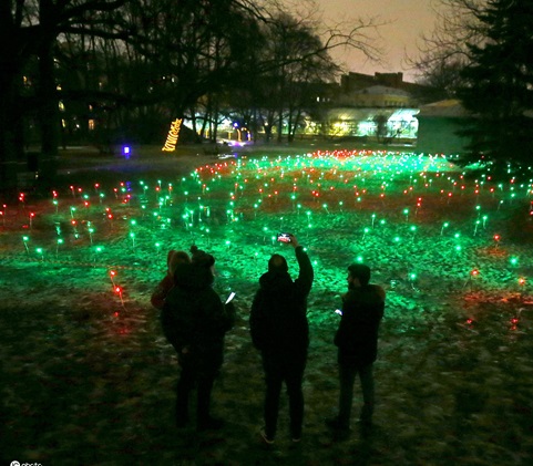 當?shù)貢r間12月24日,俄羅斯圣彼得堡,當?shù)刂参飯@舉行多媒體燈光展。此次燈光展項目將新形式的數(shù)字藝術和自然美景完美融合在一起,游客可與裝置直接互動。(圖片來源:東方IC)