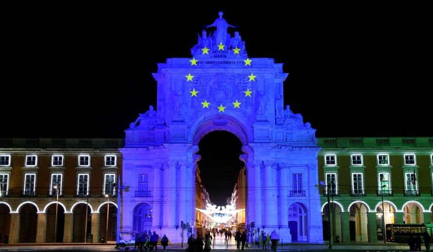 1月1日,葡萄牙里斯本的奧古斯塔街拱門上投影出歐盟旗幟的配色。