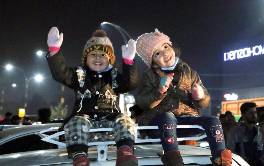 1月1日,兩名兒童在巴基斯坦拉瓦爾品第的新年慶祝活動(dòng)上照相。