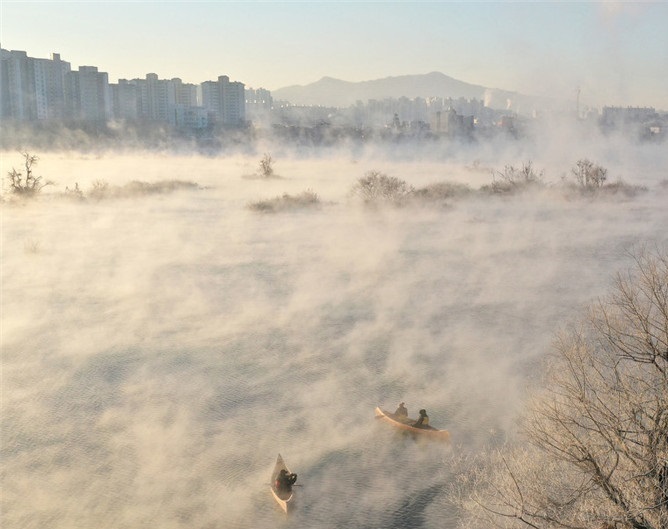 人民網(wǎng)訊 當?shù)貢r間2021年1月6日,韓國江原道春川市,民眾在水霧中乘坐皮劃艇,欣賞霧凇美景。據(jù)江原道地方氣象廳,當天春川市最低氣溫降至零下16.2攝氏度。