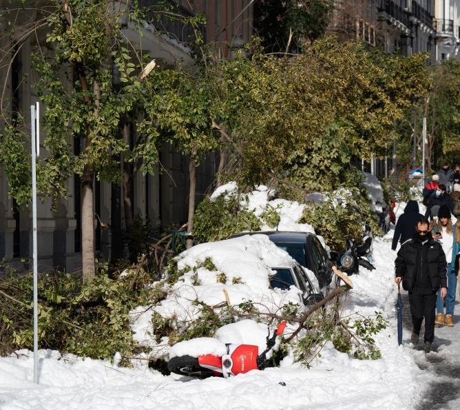 1月10日,在西班牙馬德里市中心,被雪壓斷的樹枝砸在路邊停放的車輛上。