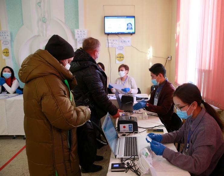 1月10日,在吉爾吉斯斯坦首都比什凱克,投票站工作人員驗(yàn)證選民身份。