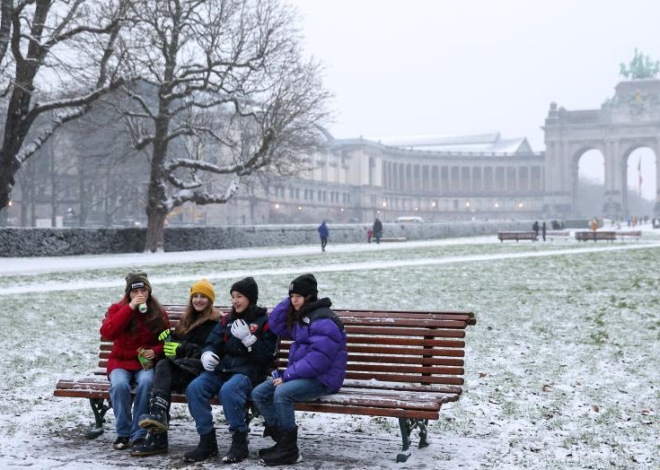 當(dāng)日,比利時首都布魯塞爾迎來降雪,吸引眾多市民來到公園賞雪、玩雪。