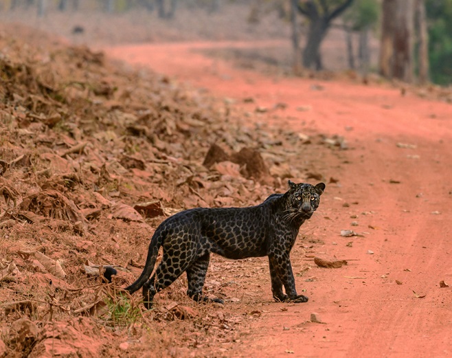 2月4日,印度馬哈拉施特拉邦,塔杜巴國家公園內(nèi)發(fā)現(xiàn)了一只極為罕見的雄性黑豹。(圖片來源:東方IC)