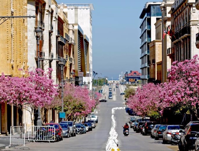 3月21日,一名女子在黎巴嫩貝魯特街頭拍攝盛開的春花。新華社發(fā)(比拉爾·賈維希攝)