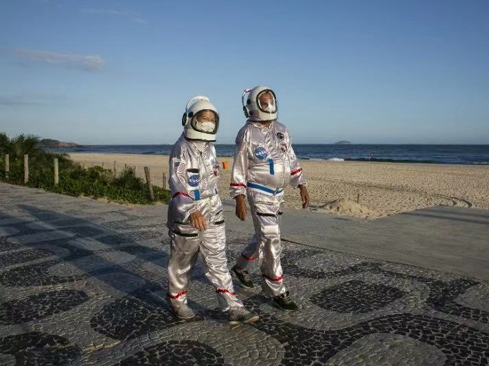 人民網訊 當地時間2021年3月20日,巴西里約熱內盧,Tercio Galdino與妻子Alicea著太空服裝扮出行伊帕尼瑪海灘,在保護自己免受新冠感染的同時呼吁民眾加強防疫。