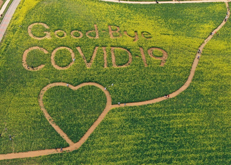 人民網(wǎng)訊 當(dāng)?shù)貢r間4月18日,韓國京畿道南部安城市,航拍鏡頭記錄下當(dāng)?shù)赜筒嘶ㄌ锢铩癎ood-Bye COVID-19”(新冠病毒,再見)的字樣。