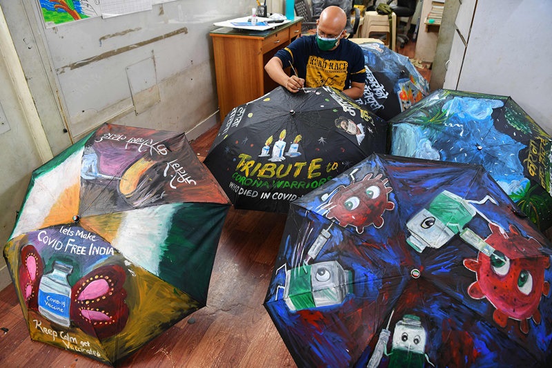 人民網(wǎng)訊 當(dāng)?shù)貢r(shí)間6月3日,印度孟買,一所藝術(shù)學(xué)校里的藝術(shù)老師Sagar Kambli繪制新冠疫苗防疫主題雨傘,以提醒學(xué)生們通過(guò)接種新冠疫苗防疫。