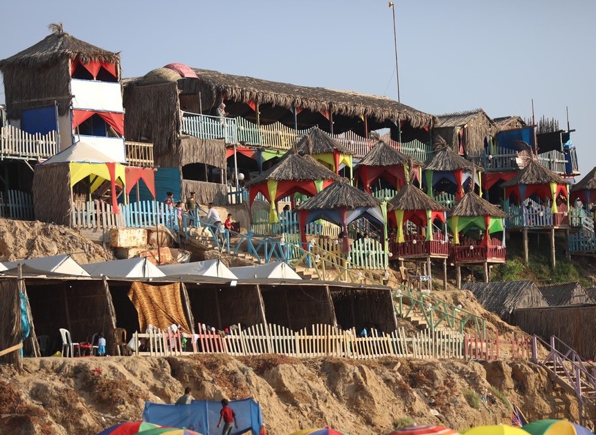人民網(wǎng)訊 當(dāng)?shù)貢r(shí)間2021年6月25日,巴勒斯坦Deir al-Balah,當(dāng)?shù)鼐用裥∧疚葜懈╊刂泻:瑯废硐娜諘r(shí)光。海灘是這個(gè)城市為數(shù)不多開放的公共空間之一。