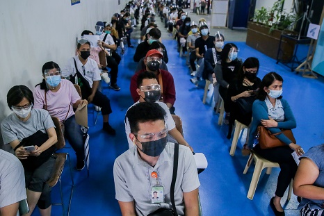 7月27日,在菲律賓圣胡安,人們排隊等待接種新冠疫苗。