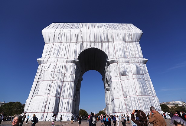 “被包裹的凱旋門”是保加利亞已故藝術(shù)家赫里斯托和妻子讓娜-克洛德的遺作。根據(jù)他們的構(gòu)思,巴黎地標建筑凱旋門被可回收的織物包裹起來。目前,凱旋門已被2.5萬平方米藍銀色可回收織物“包裹”,并用3000米紅繩固定。“被包裹的凱旋門”藝術(shù)展于18日正式向公眾開放,10月3日結(jié)束。