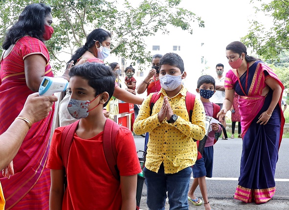 10月25日,在印度班加羅爾,學(xué)生進(jìn)入學(xué)校前接受體溫檢測(cè)。