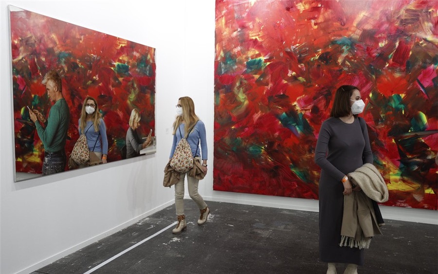 人民網(wǎng)訊 當?shù)貢r間2月27日,西班牙馬德里,2022馬德里當代藝術博覽會的最后一天,參觀者在欣賞藝術品。