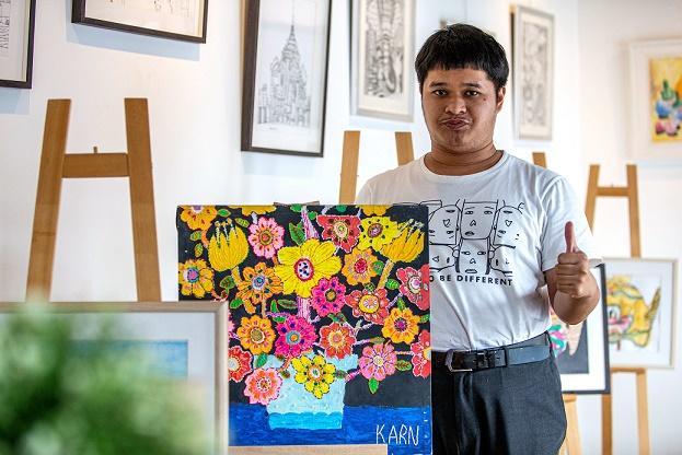 圖為4月2日,在位于曼谷的泰國(guó)孤獨(dú)癥職業(yè)中心,一名孤獨(dú)癥患者展示自己的繪畫作品。新華社記者 王騰 攝