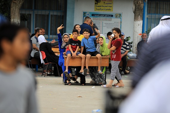 9日,巴勒斯坦人在加沙地帶南部城市汗尤尼斯的一所學(xué)校躲避以色列空襲。新華社發(fā)(亞西爾·庫迪攝)