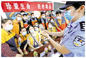 6月22日,安徽省淮北市總工會聯(lián)合淮北市公安局相山分局西區(qū)派出所開展禁毒宣傳走進物流園區(qū)活動,現場通過仿真毒品展示、發(fā)放宣傳單、承諾簽名等形式,向物流從業(yè)人員宣傳毒品種類、毒品辨別、毒品危害等知識,倡導遠離毒品健康生活。圖為民警向物流從業(yè)人員宣傳禁毒知識?! ?/p>