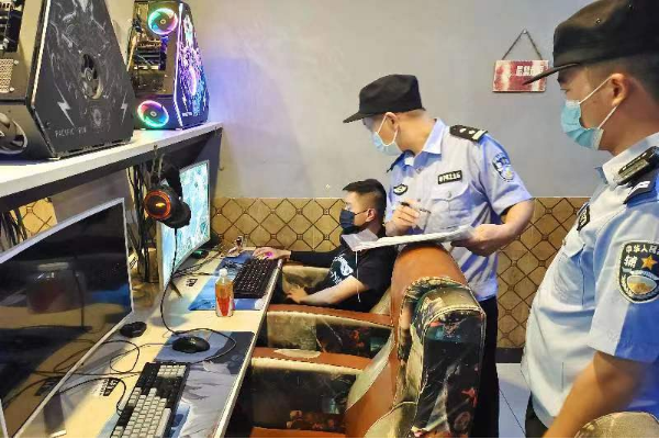 暑假以來,浙江省臺州市公安局椒江分局加強(qiáng)對網(wǎng)吧的安全檢查,重點(diǎn)檢查網(wǎng)吧上網(wǎng)者是否實(shí)名登記、是否接納未成年人上網(wǎng)、安全制度是否落實(shí)到位等情況,消除各類安全隱患,規(guī)范網(wǎng)吧經(jīng)營秩序。圖為7月27日,下陳派出所民警在一家網(wǎng)吧對上網(wǎng)人員的身份進(jìn)行檢查登記。