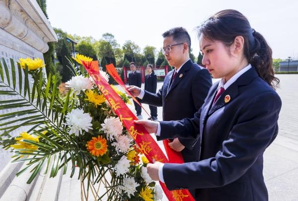 4月1日,河南省南陽市南召縣人民檢察院干警向烈士紀念碑敬獻花籃。 法治日報全媒體記者 趙紅旗 攝