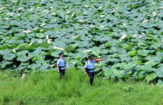 安徽省阜南縣曹集鎮(zhèn)位于淮河岸邊,當(dāng)?shù)卮迕窭脻竦厮练N植藕蓮發(fā)展特色經(jīng)濟(jì),阜南縣公安局安崗派出所組織警力加強(qiáng)萬畝藕蓮基地白天夜晚的巡查力度,護(hù)航鄉(xiāng)村振興經(jīng)濟(jì)發(fā)展。圖為8月2日民警在曹集鎮(zhèn)萬畝藕蓮基地開展巡查工作。法治日報(bào)全媒體通訊員 呂乃明 攝
