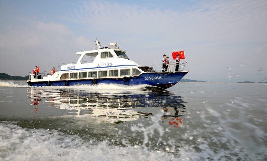 5月20日,江西省九江市公安局濂溪分局水上派出所聯(lián)合漁政、海事等部門(mén)開(kāi)展長(zhǎng)江、鄱陽(yáng)湖禁漁期“平安水域”專項(xiàng)行動(dòng)。法治日?qǐng)?bào)全媒體通訊員 游建棟 攝