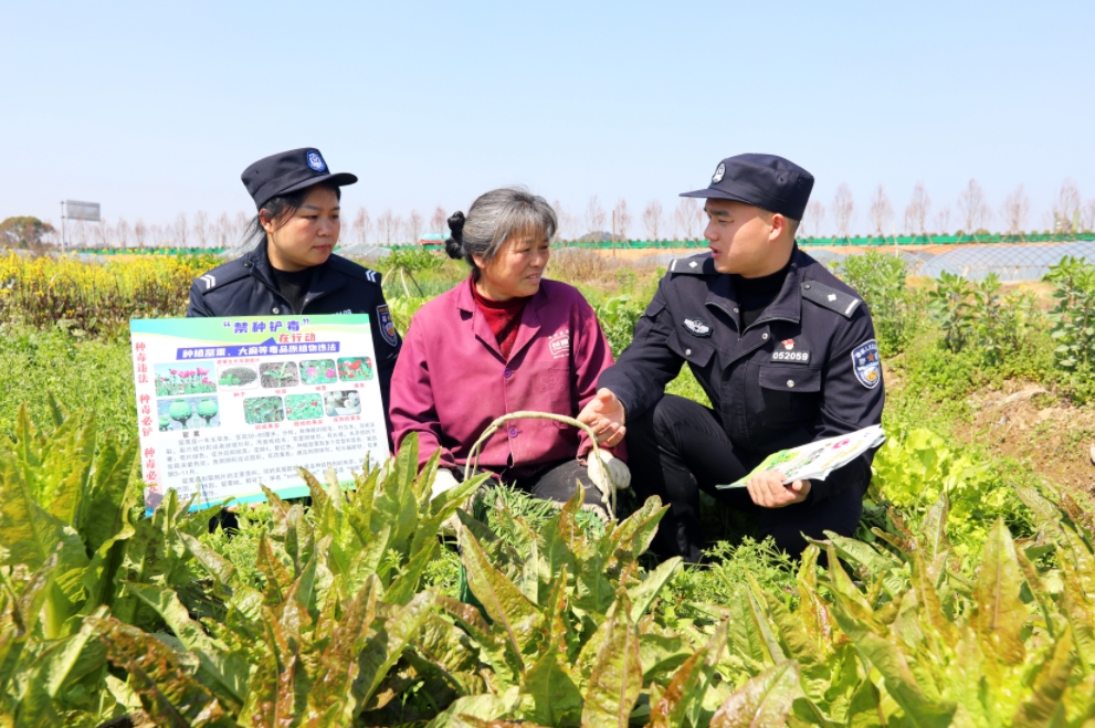 圖為民警走進田間地頭向群眾宣傳禁種鏟毒知識。