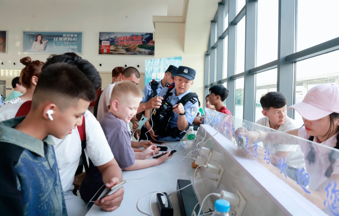 圖為阿克蘇站派出所民警在候車室自助充電樁前對(duì)旅客進(jìn)行安全提醒。武隴慧 攝