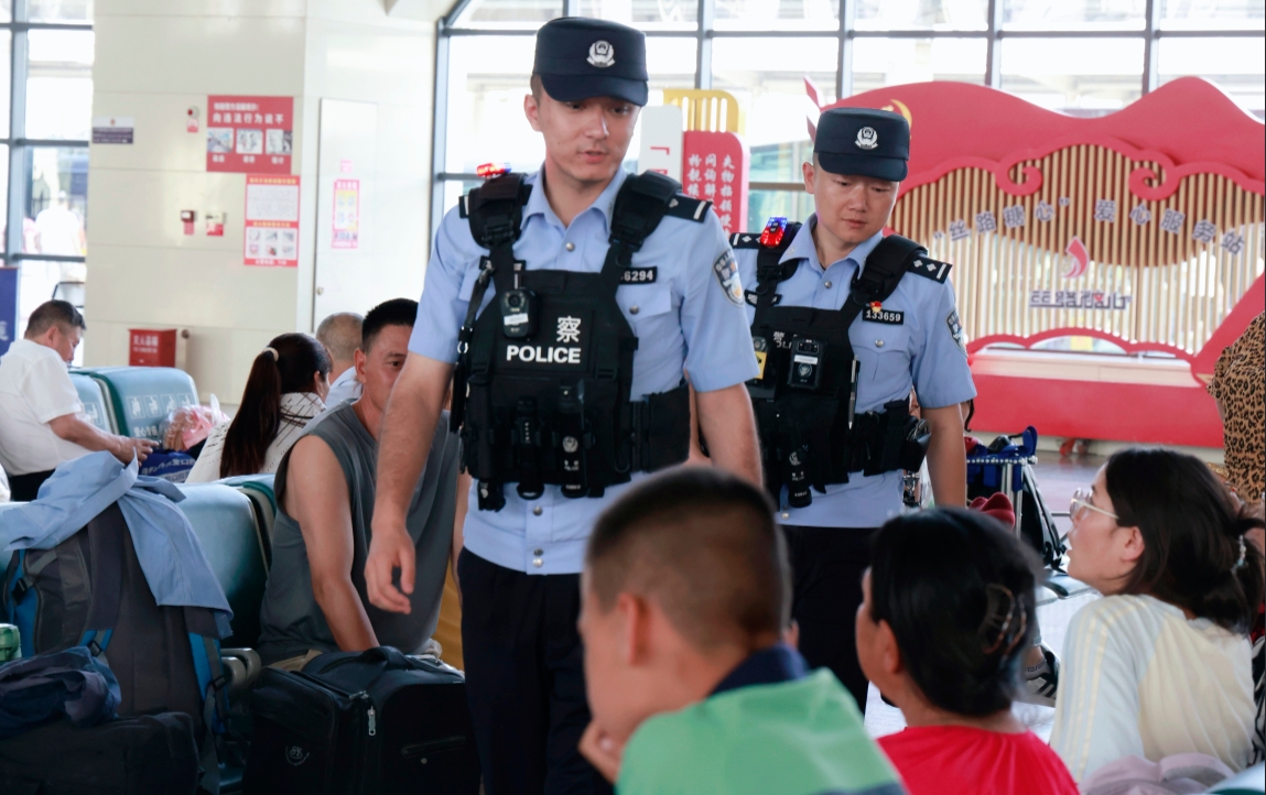 圖為阿克蘇站派出所民警在候車室巡視檢查,對(duì)帶孩子的旅客進(jìn)行重點(diǎn)安全提醒。武隴慧 攝