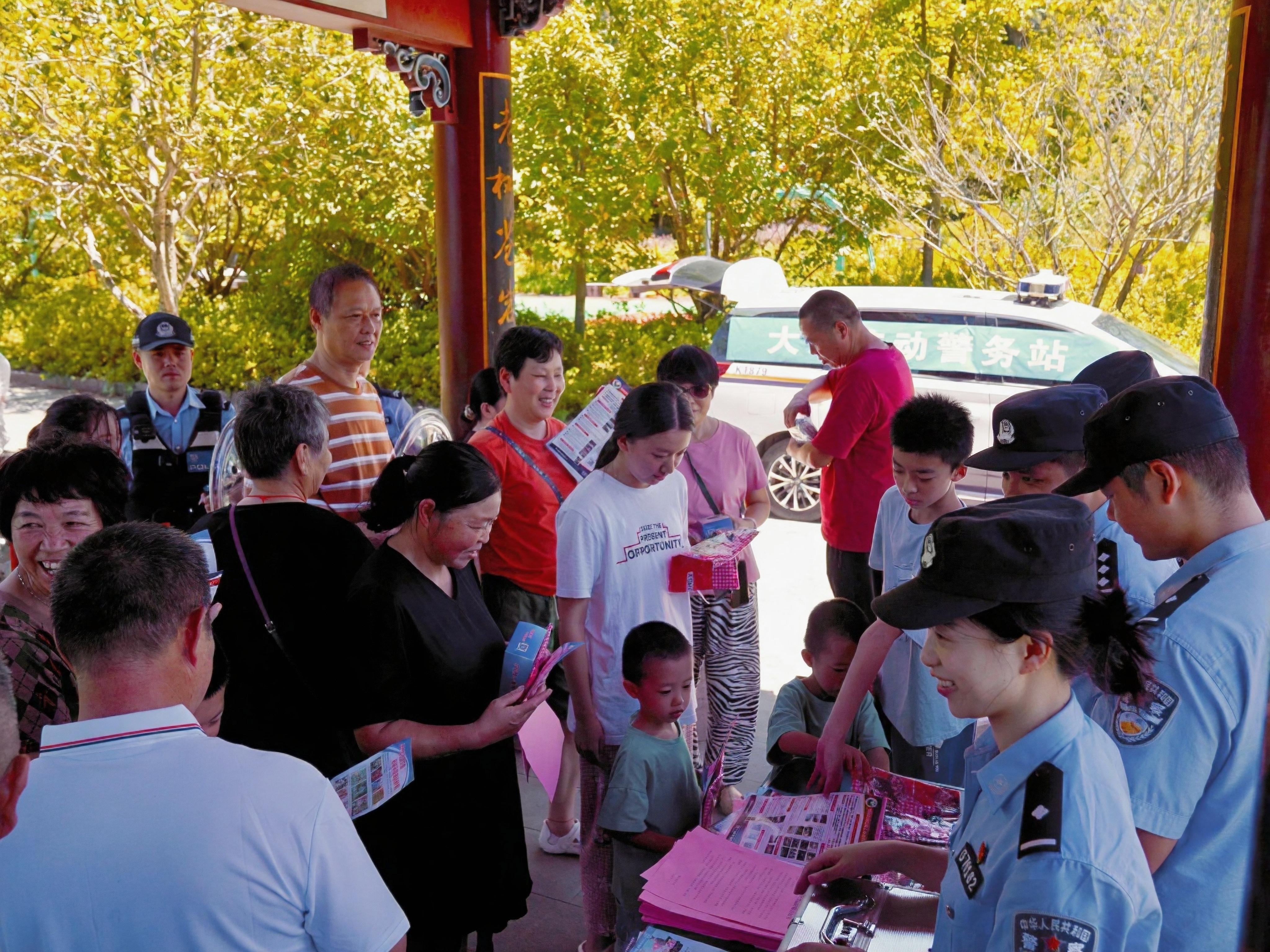 盛夏七月,海拔近千米的大洋鎮(zhèn)迎來(lái)避暑客流高峰。綠林中的大洋水庫(kù)旁新設(shè)的“警務(wù)涼亭”成了游客歇腳點(diǎn)。7月14日中午,民警張洵正向圍坐的游客遞上涼茶,普及反詐知識(shí)。