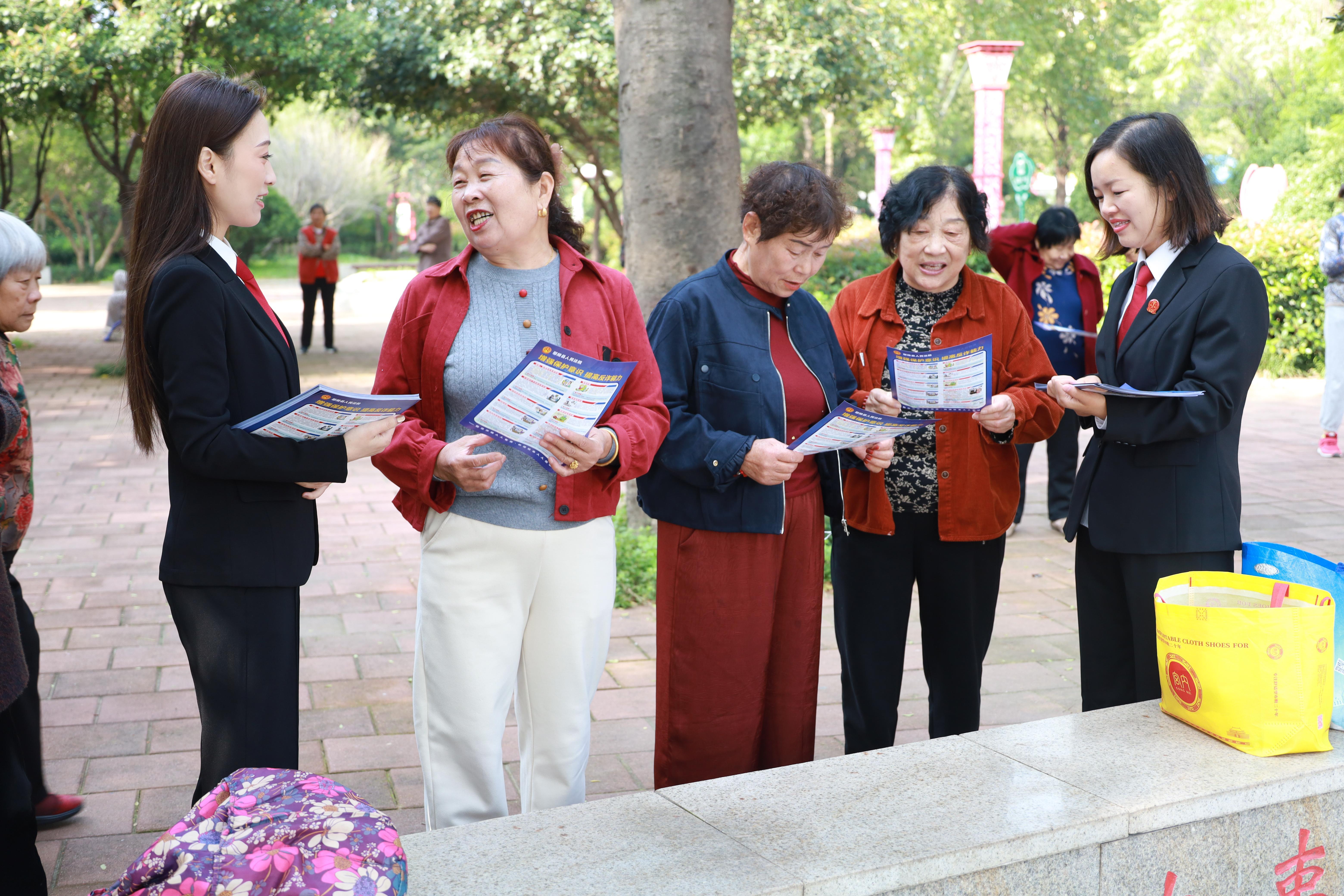 圖為法院干警在公園給老年人以案普法。