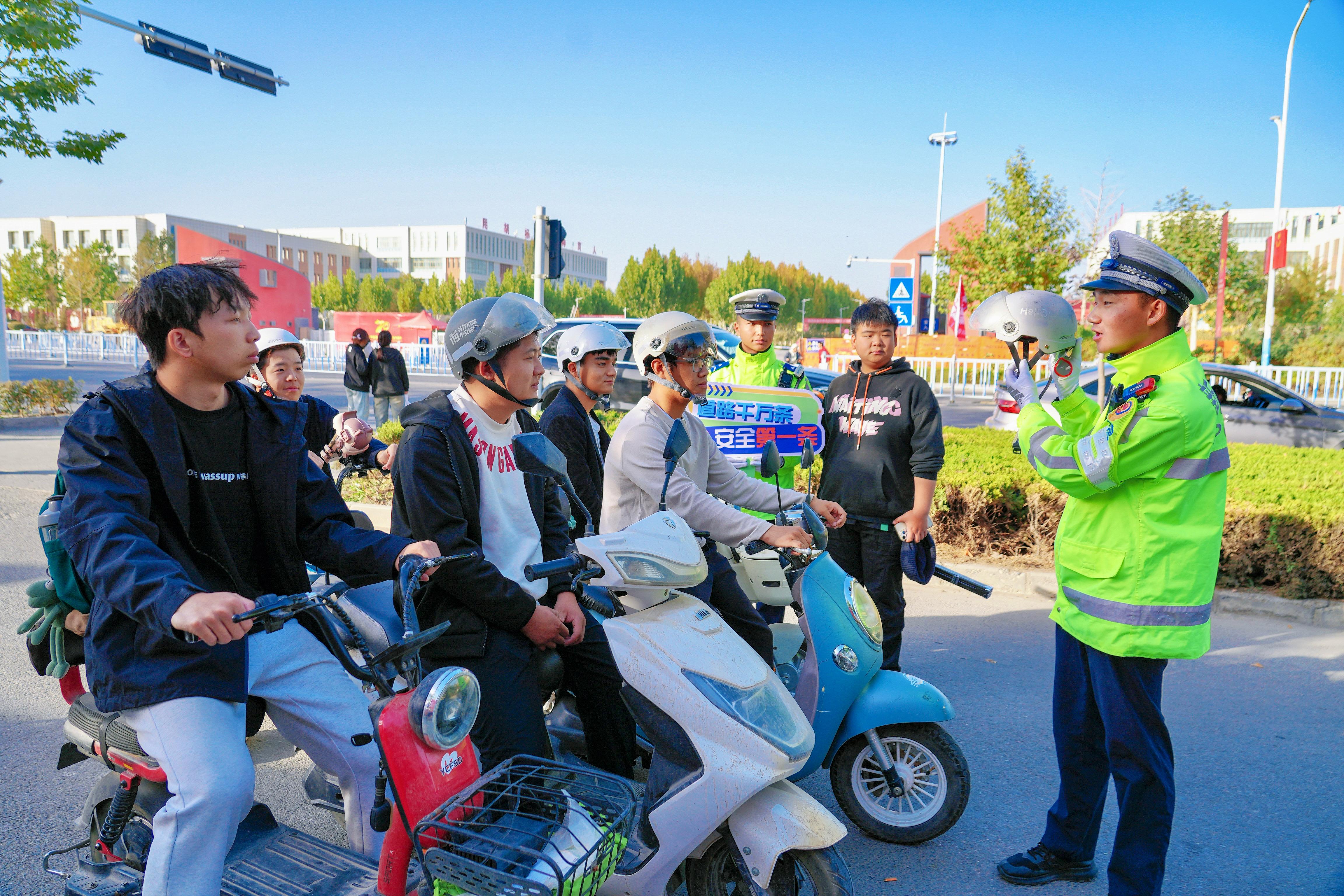 圖為交警向?qū)W生講解如何正確佩戴頭盔。