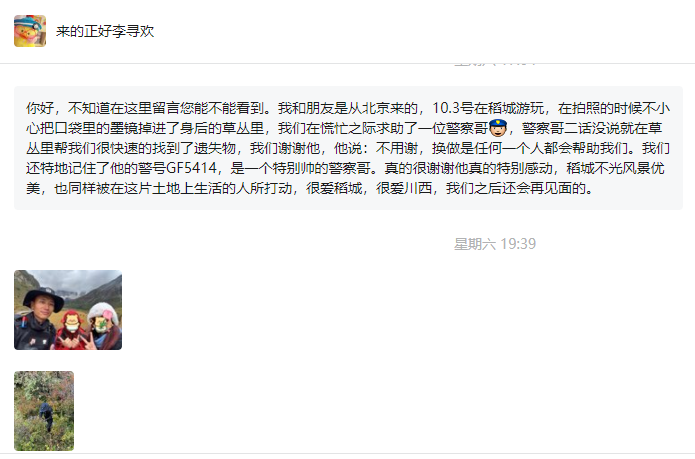 “你好,不知道在這里留言您能不能看到。我和朋友是從北京來的,10月3號(hào)日在稻城游玩,在拍照的時(shí)候不小心把口袋里的墨鏡掉進(jìn)了身后的草叢里,我們?cè)诨琶χH求助了一位警察哥,警察哥二話沒說就在草叢里幫我們很快速的找到了遺失物,我們謝謝他,他說:不用謝,換做是任何一個(gè)人都會(huì)幫助我們。我們還特地記住了他的警號(hào)GF5414,是一個(gè)特別帥的警察哥。真的很謝謝他真的特別感動(dòng),稻城不光風(fēng)景優(yōu)美,也同樣被在這片土地上生活的人所打動(dòng),很愛稻城,很愛川西,我們之后還會(huì)再見面的?!?/p>